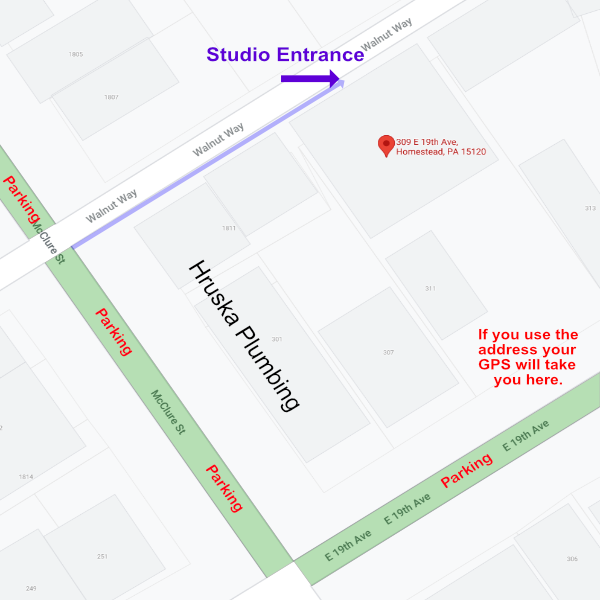 The studio entrance is on Walnut Way behind the building. I’ve put links below for Google and Apple Maps that will take you directly to the studio entrance.